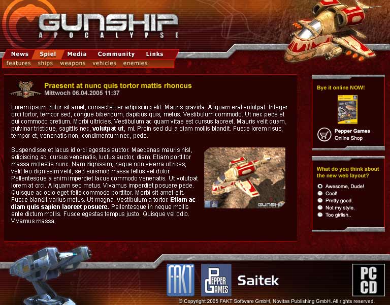 31 Aug 2019 0 Comment(s) CONCEPTS/ LAYOUTS Gunship Apocalypse: Concepts & Layouts Arcade-Ego-Shooter Game my role, what I did: character- / props- / environment- concepts modeling, texturing leveldesign animation ... ... ... ... ... ... ... ... ... ... ... ... ... ... ... ... ... ... ... ... ... ... ... ... ... ... ... Gunship Apocalypse - Animation of Enemy: Infanterist Gunship Apocalypse - Animation of Enemy: Boss Spider Gunship Apocalypse - GSA Game Trailer Prev Next
